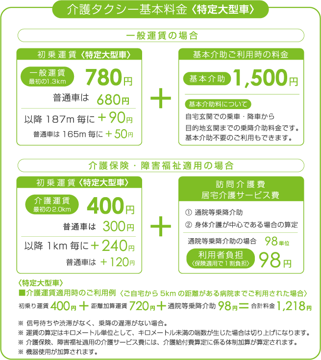 ※介護運賃でのご利用は、要介護認定の方で、ケアマネジャーが作成するケアプランに基づき、訪問介護サービスとして行う輸送に限りご利用できます。
