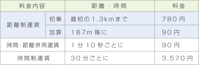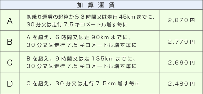 ※ただし、所定の時間又は走行距離を超過した分については、時間制又は距離制運賃の加算運賃C以降を適用する。